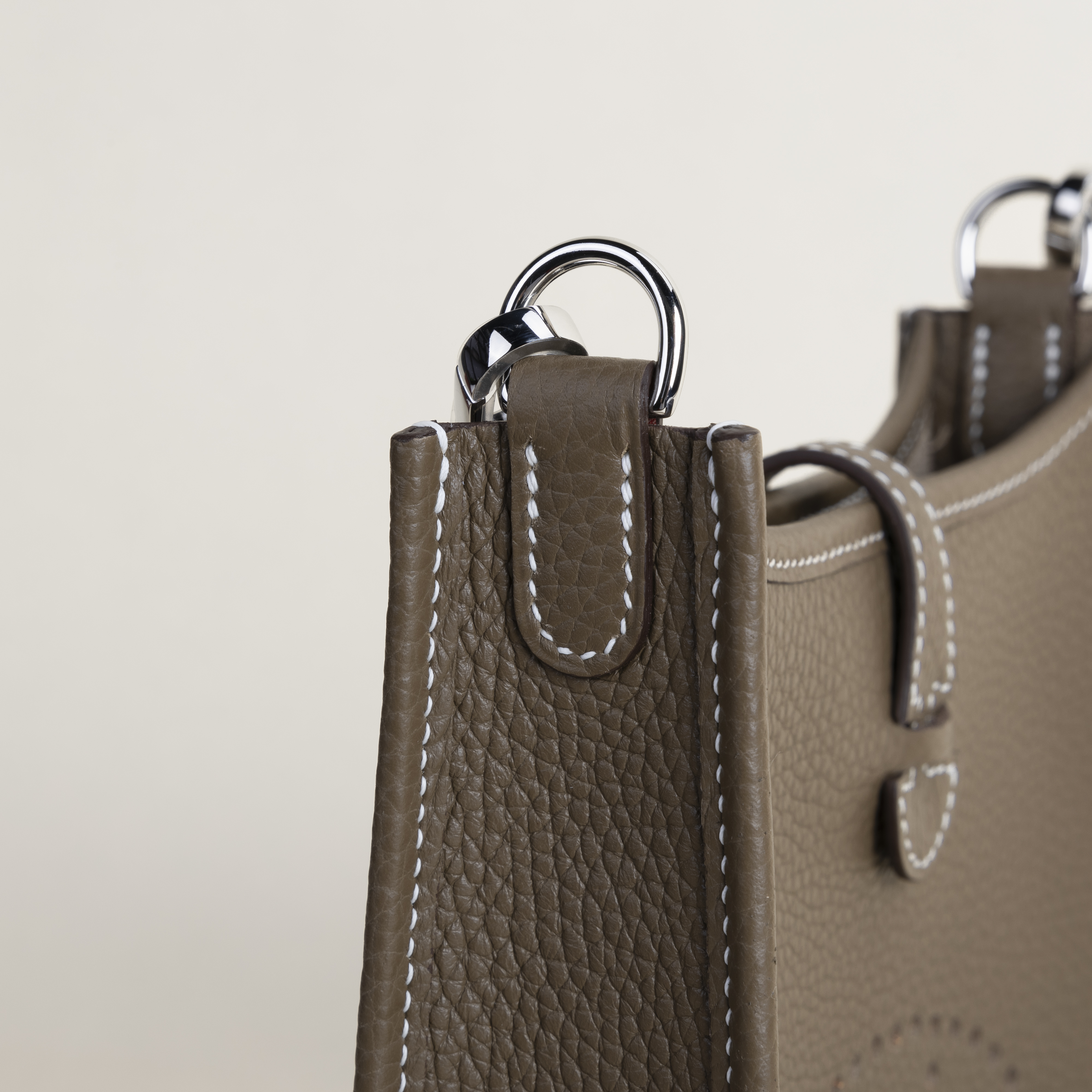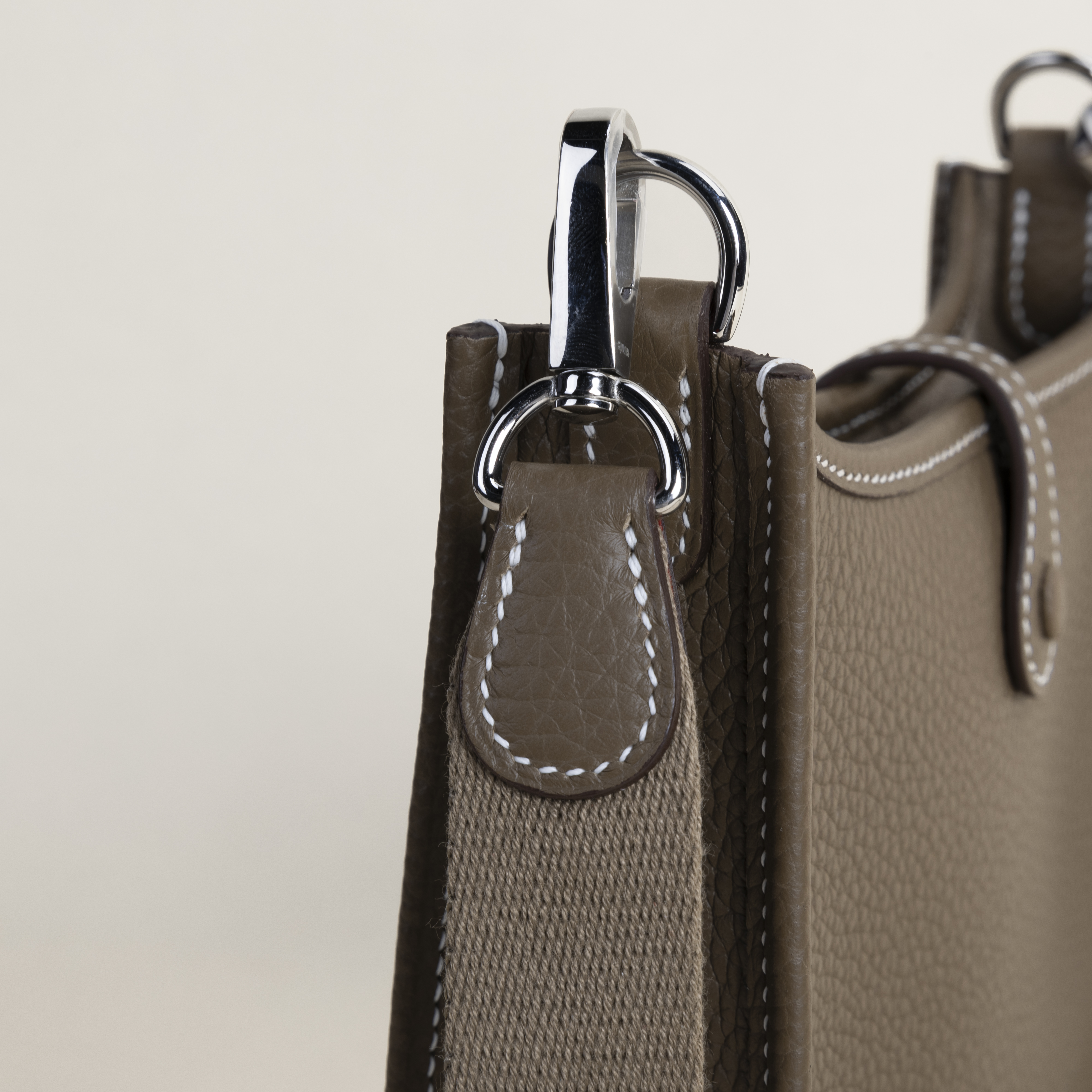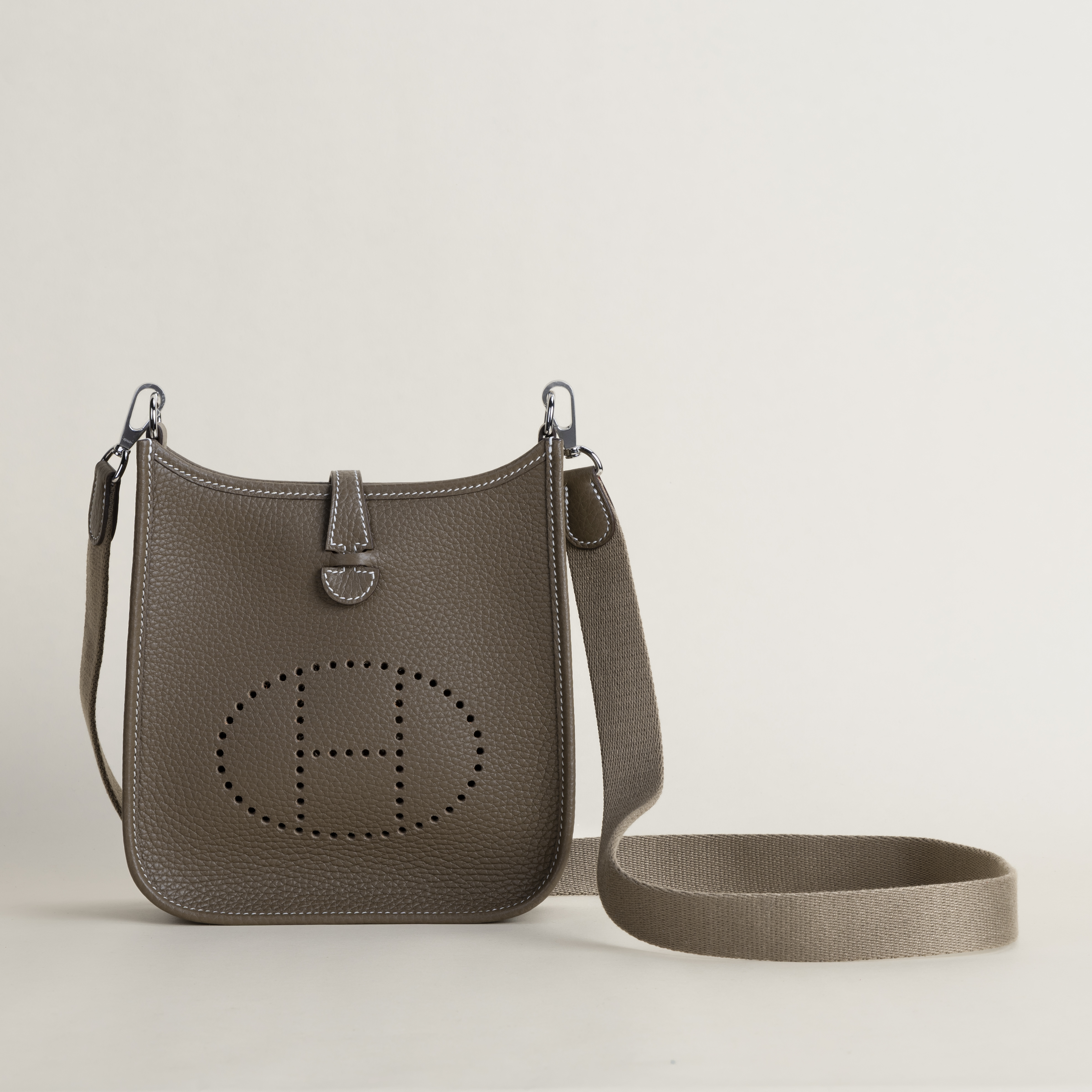 Model :Evelyne miniColor :18 etoupeMaterial :Clemence leather Hardware :SilverMeasurements :(w)18x(H)16x(D)5.5cm Accompanied:shoulderstrap,Padlock,Key,Raincover,Box,Cotton bag